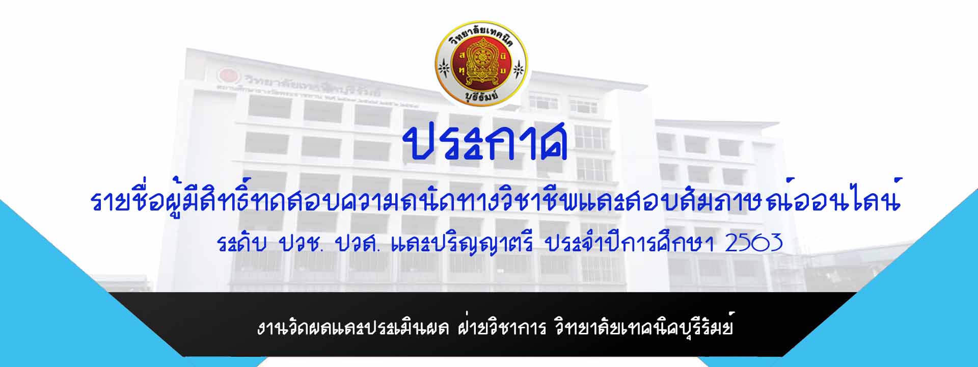 ประกาศรายชื่อผู้มีสิทธิ์ทดสอบความถนัดทางวิชาชีพและสอบสัมภาษณ์ออนไลน์ ระดับ ปวช. ปวส. และปริญญาตรี ประจำปีการศึกษา 2563...