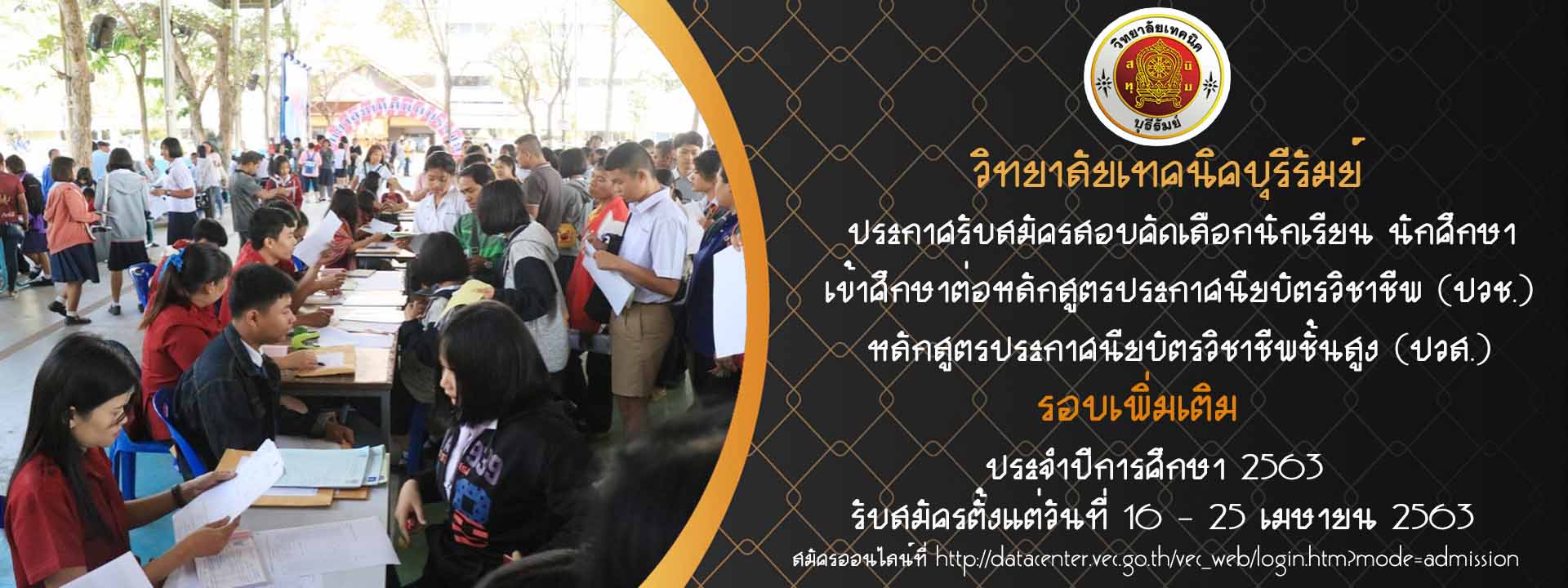 ประกาศรับสมัครสอบคัดเลือกนักเรียน นักศึกษา เข้าศึกษาต่อหลักสูตรประกาศนียบัตรวิชาชีพ (ปวช.) หลักสูตรประกาศนียบัตรวิชาชีพชั้นสูง (ปวส.) รอบเพิ่มเติม ประจำปีการศึกษา 2563...