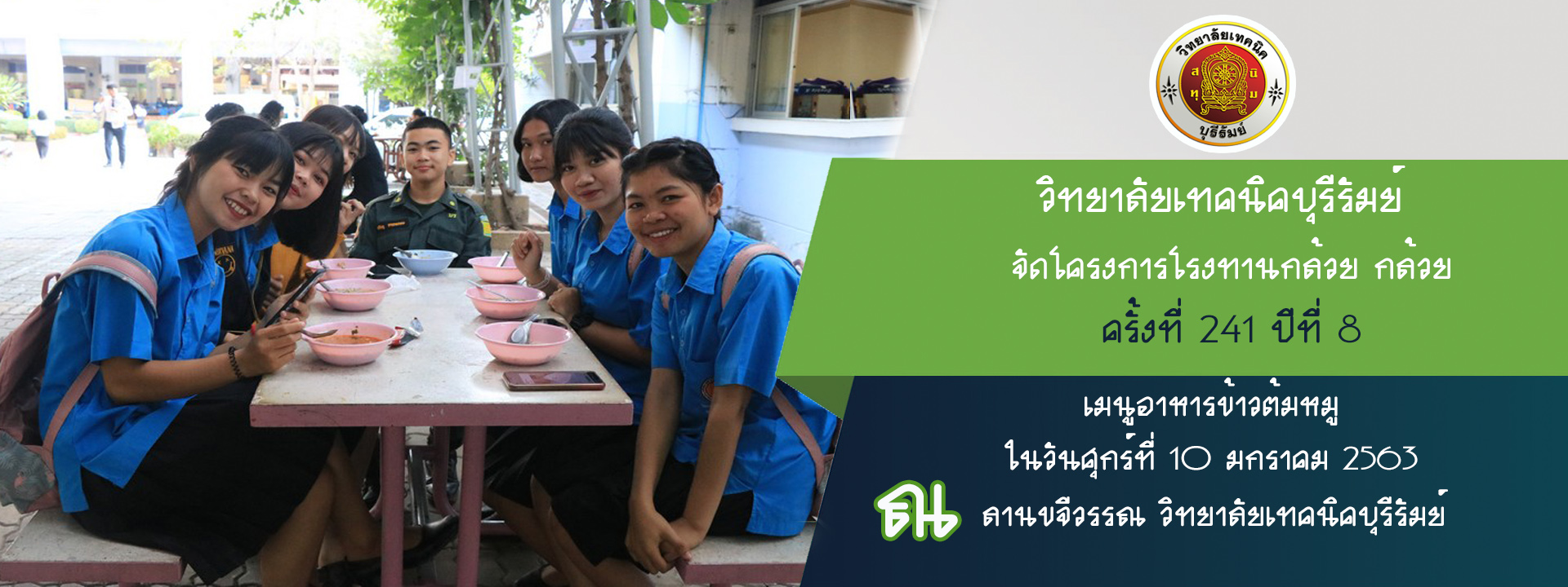 วิทยาลัยเทคนิคบุรีรัมย์ ดำเนินโครงการโรงทานกล้วย กล้วย ครั้งที่ 241 ปีที่ 8 ในวันศุกร์ที่ 10 มกราคม 2563 ณ ลานขจีวรรณ วิทยาลัยเทคนิคบุรีรัมย์ เมนูอาหาร ข้าวต้มหมู ...