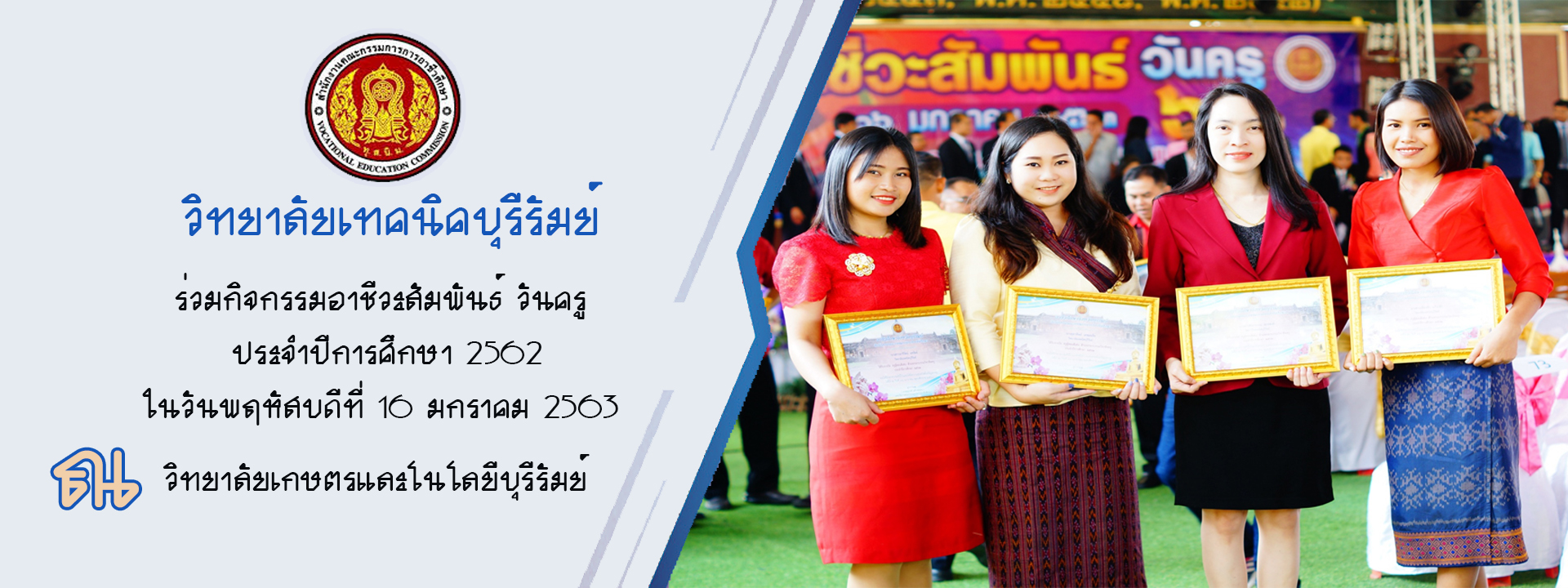 วิทยาลัยเทคนิคบุรีรัมย์ ร่วมกิจกรรมอาชีวะสัมพันธ์ วันครู ประจำปีการศึกษา 2562 ในวันพฤหัสบดีที่ 16 มกราคม 2563 ณ วิทยาลัยเกษตรและโนโลยีบุรีรัมย์...