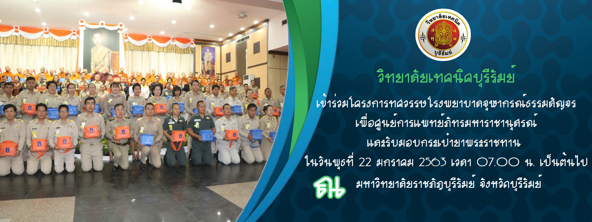 วิทยาลัยเทคนิคบุรีรัมย์ เข้าร่วมโครงการทศวรรษโรงพยาบาลจุฬากรณ์ธรรมสัญจรเพื่อศูนย์การแพทย์ภัทรมหาราชานุสรณ์ และรับมอบกระเป๋ายาพระราชทาน ในวันพุธที่ 22 มกราคม 2563 เวลา 07.00 น. เป็นต้นไป ณ มหาวิทยาลัยราชภัฎบุรีรัมย์ จังหวัดบุรีรัมย์...