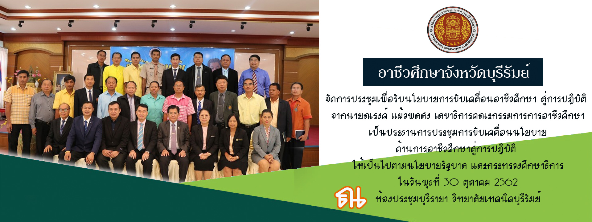 อาชีวศึกษาจังหวัดบุรีรัมย์ จัดการประชุมเพื่อรับนโยบายการขับเคลื่อนอาชีวศึกษา สู่การปฏิบัติ จากนายณรงค์ แผ้วพลสง เลขาธิการคณะกรรมการการอาชีวศึกษา เป็นประธานการประชุมการขับเคลื่อนนโยบายด้านการอาชีวศึกษาสู่การปฏิบัติ ให้เป็นไปตามนโยบายรัฐบาล และกระทรวงศึกษ...