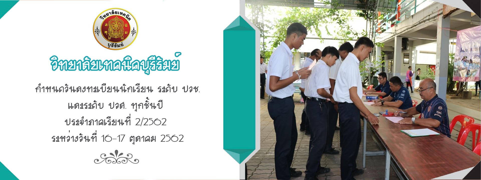 วิทยาลัยเทคนิคบุรีรัมย์ กำหนดจัดลงทะเบียนเรียน ระดับ ปวช. และปวส. ทุกชั้นปี ประจำภาคภาคเรียนที่ 2 ปีการศึกษา 2562 ระหว่างวันที่ 16-17 ตุลาคม 2562...