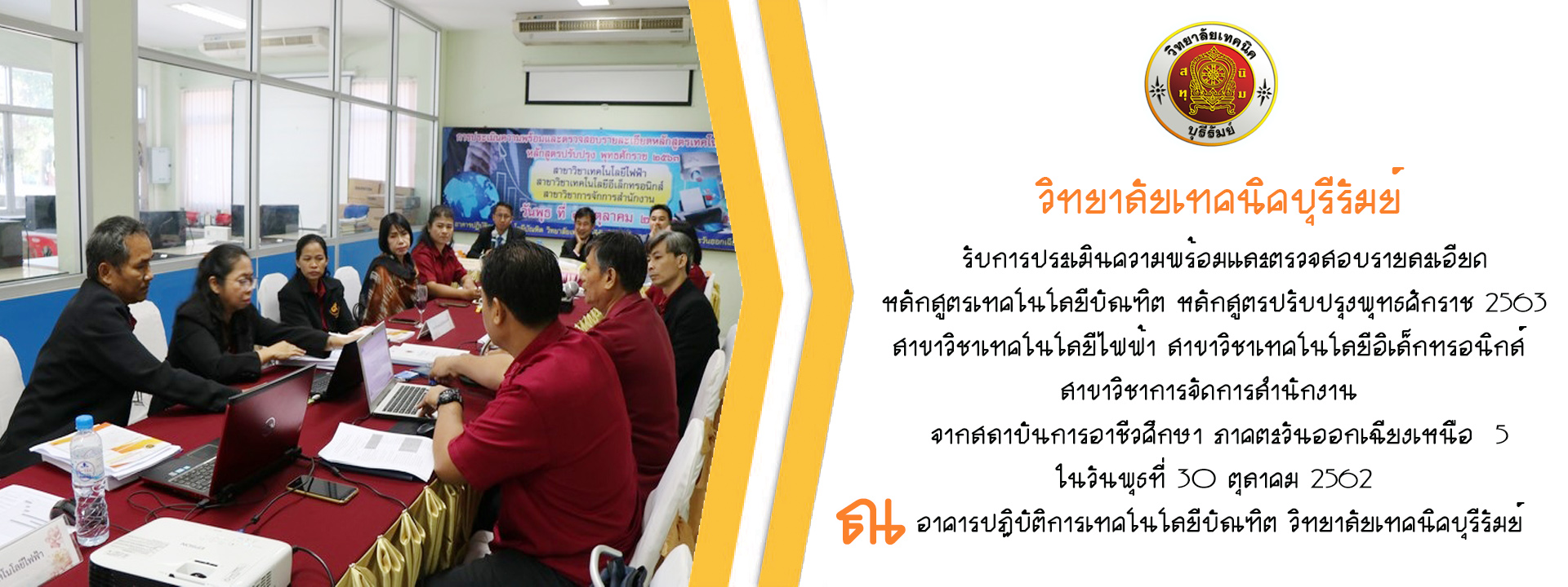 วิทยาลัยเทคนิคบุรีรัมย์ รับการประเมินความพร้อมและตรวจสอบรายละเอียดหลักสูตรเทคโนโลยีบัณฑิต หลักสูตรปรับปรุงพุทธศักราช 2563 สาขาวิชาเทคโนโลยีไฟฟ้า สาขาวิชาเทคโนโลยีอิเล็กทรอนิกส์ สาขาวิชาการจัดการสำนักงาน จากสถาบันการอาชีวศึกษา ภาคตะวันออกเฉียงเหนือ 5 ...