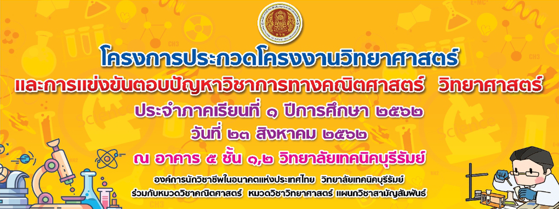 องค์การนักวิชาชีพในอนาคตแห่งประเทศไทย วิทยาลัยเทคนิคบุรีรัมย์ ร่วมกับหมวดวิชาคณิตศาสตร์ หมวดวิชาวิทยาศาสตร์ แผนกวิชาสามัญสัมพันธ์ จัดโครงการประกวดโครงงานวิทยาศาสตร์ และการแข่งขันตอบปัญหาวิชาการทางคณิตศาสตร์ วิทยาศาสตร์ ประจำภาคเรียนที่ 1 ปีการศึก 2...