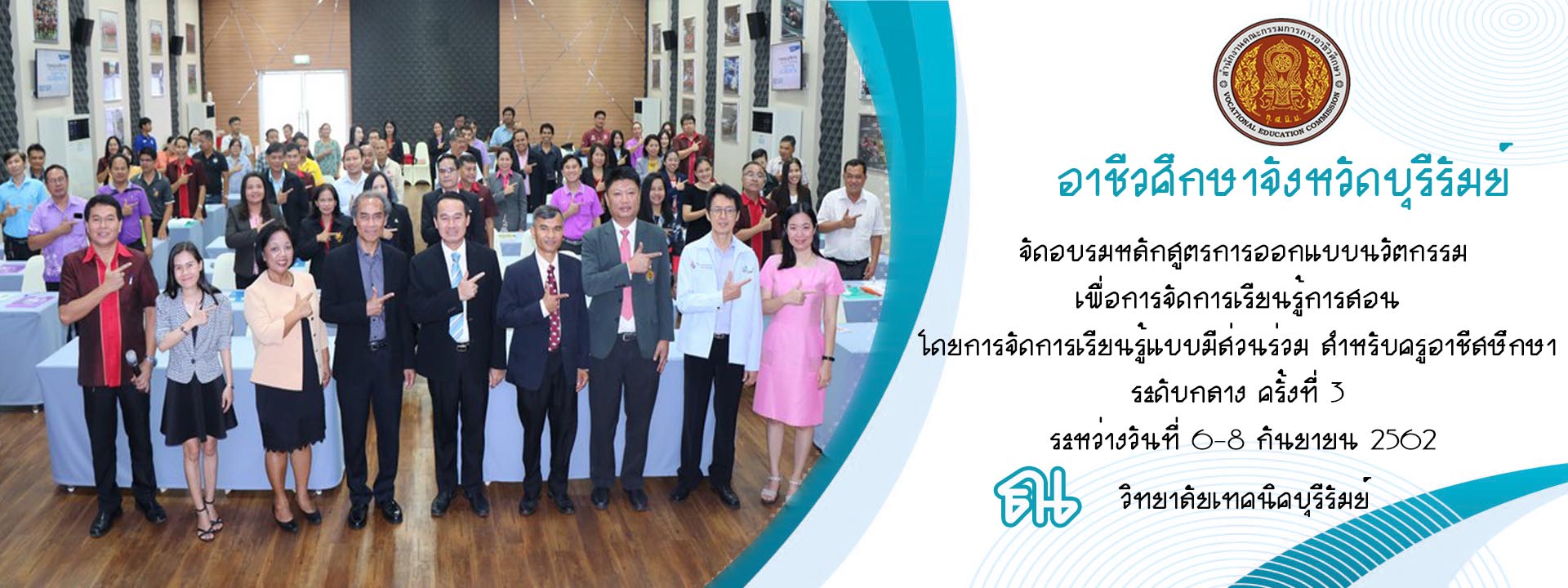 อาชีวศึกษาจังหวัดบุรีรัมย์ จัดอบรมหลักสูตรการออกแบบนวัตกรรมเพื่อการจัดการเรียนรู้การสอน โดยการจัดการเรียนรู้แบบมีส่วนร่วม สำหรับครูอาชีสษึกษา ระดับกลาง ครั้งที่ 3 ระหว่างวันที่ 6-8 กันยายน 2562 ณ วิทยาลัยเทคนิคบุรีรัมย์...