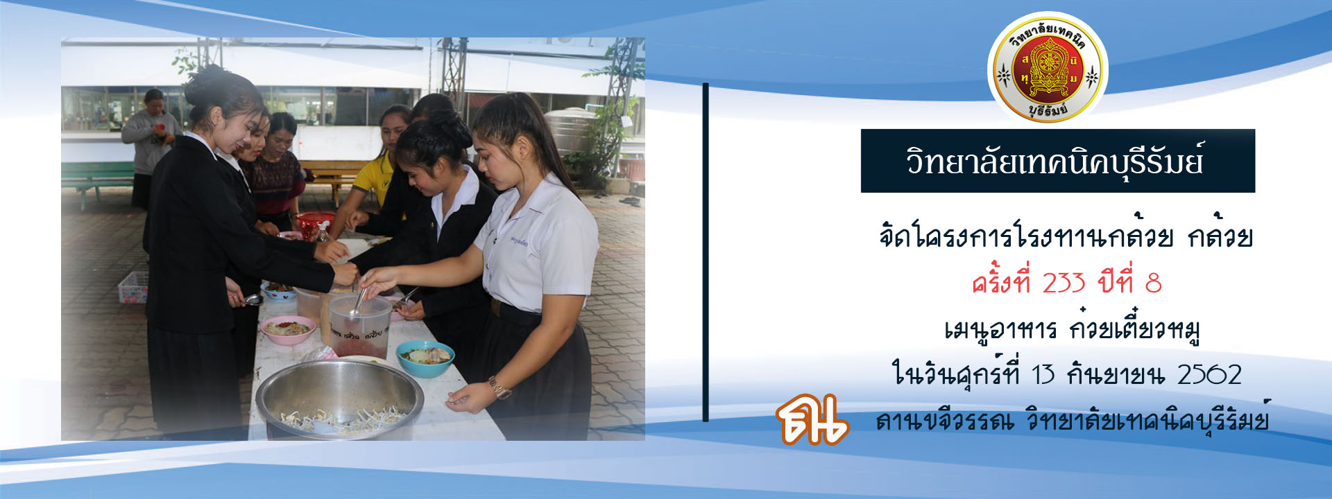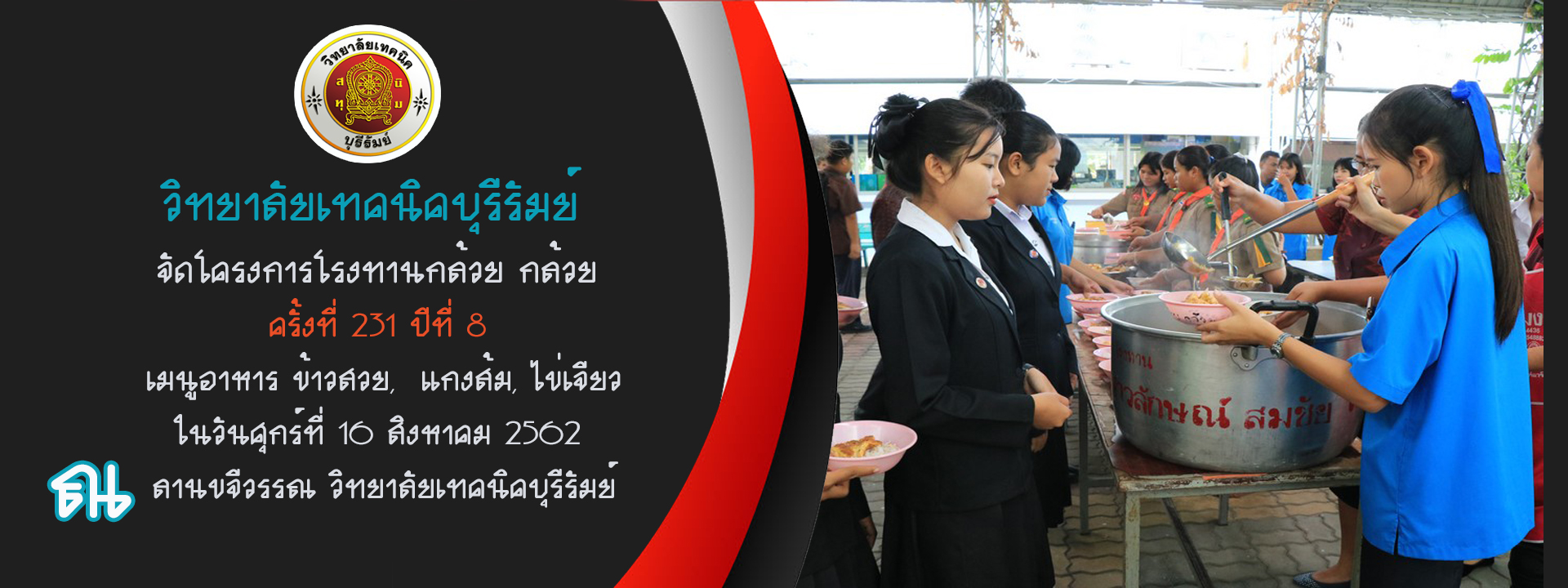 วิทยาลัยเทคนิคบุรีรัมย์ ดำเนินโครงการโรงทานกล้วย กล้วย ครั้งที่ 231 ปีที่ 8 วันศุกร์ ที่ 16 สิงหาคม 2562 ณ ลานขจีวรรณ เมนู ข้าวสวย แกงส้ม ไข่เจียว ...