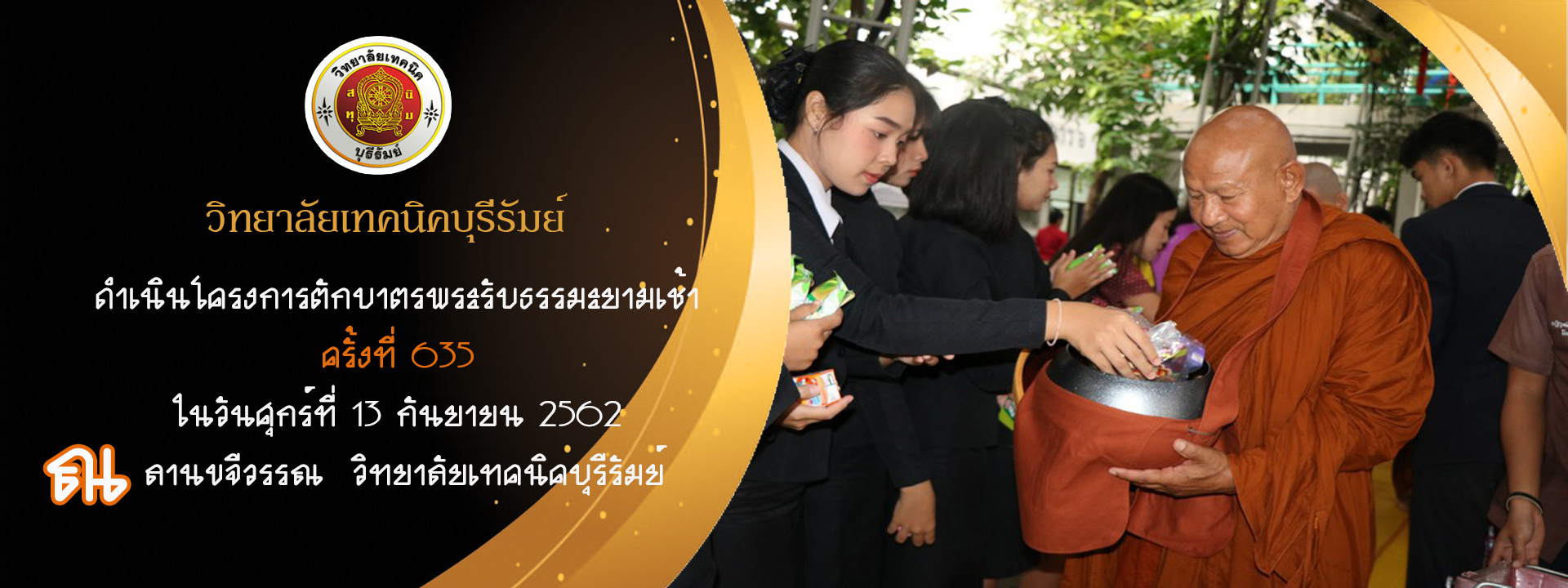 วิทยาลัยเทคนิคบุรีรัมย์ ดำเนินโครงการตักบาตรพระ รับธรรมะยามเช้า ครั้งที่ 633 ในวันศุกร์ที่ 13 กันยายน 2562 ณ ลานขจีวรรณ ...