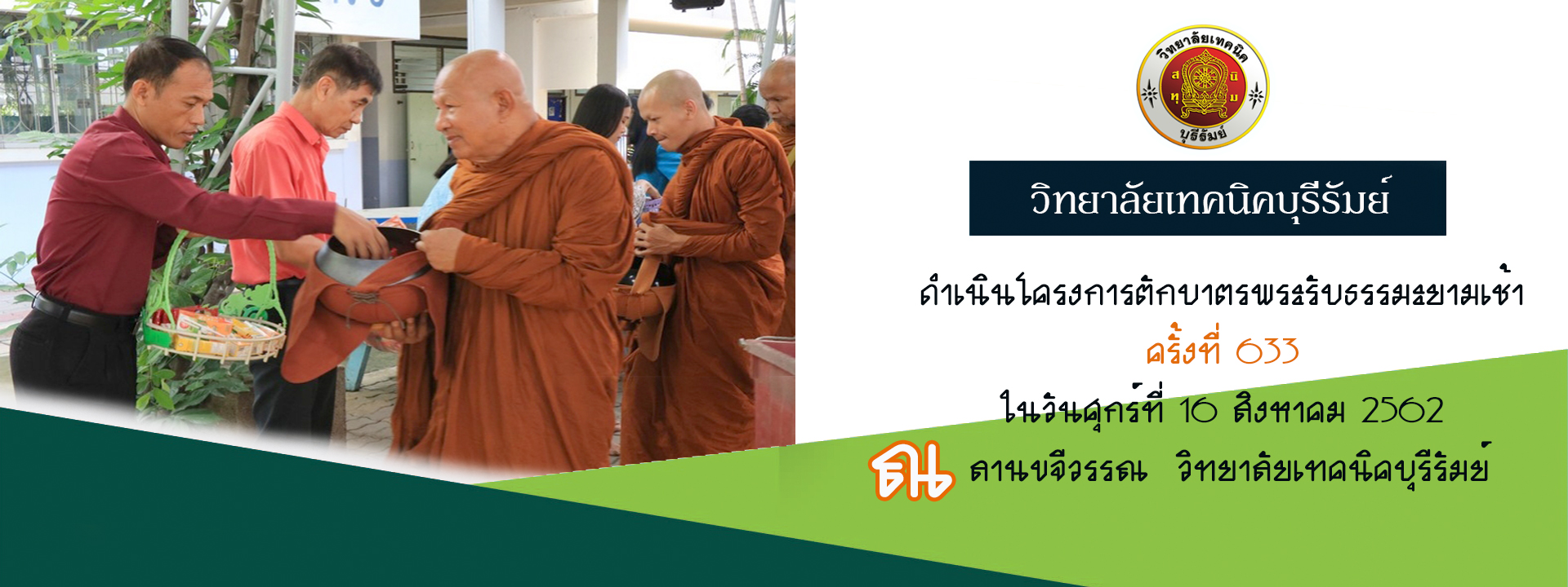 วิทยาลัยเทคนิคบุรีรัมย์ ดำเนินโครงการตักบาตรพระ รับธรรมะยามเช้า ครั้งที่ 633 ในวันศุกร์ ที่ 16 สิงหาคม 2562 ณ ลานขจีวรรณ ...