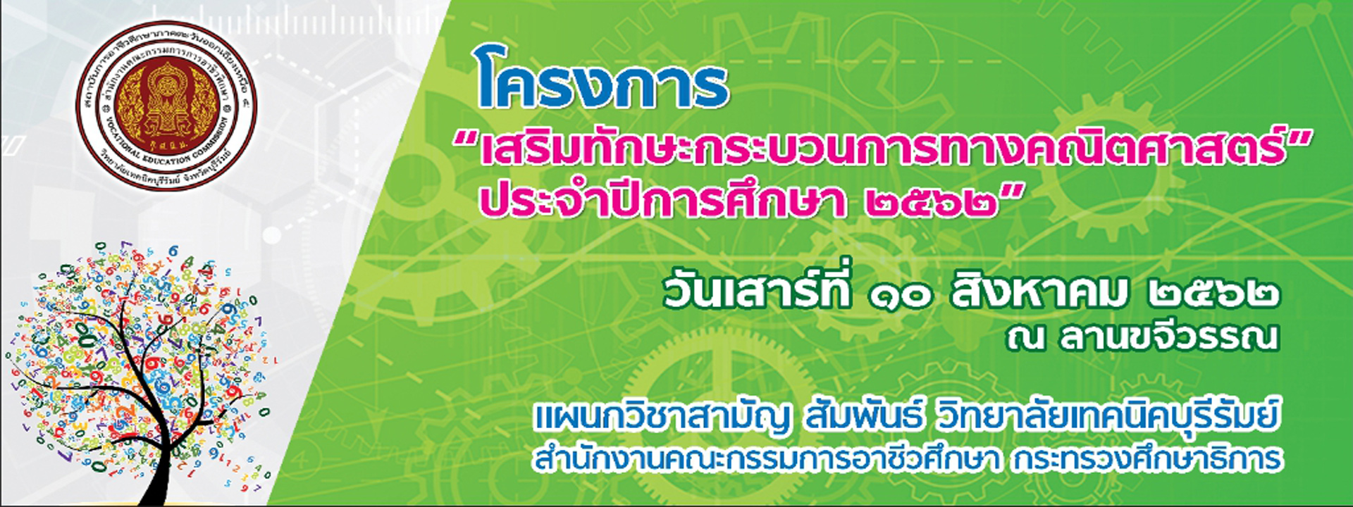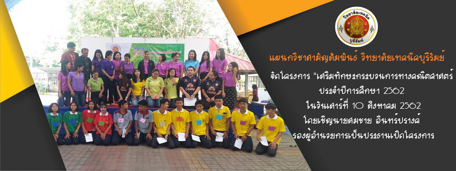 แผนกวิชาสามัญ สัมพันธ์ วิทยาลัยเทคนิคบุรีรัมย์ จัดโครงการ “เสริมทักษะกระบวนการทางคณิตศาสตร์ ประจำปีการศึกษา 2562 ในวันเสาร์ ที่ 10 สิงหาคม 2562 โดยเชิญนายสมชาย อินทร์ปรางค์ รองผู้อำนวยการเป็นประธานเปิดโครงการ...