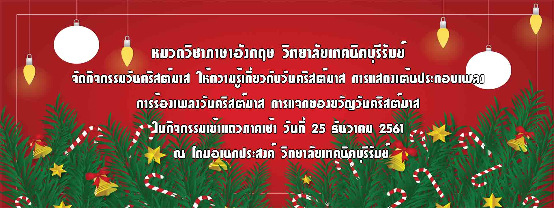 หมวดวิชาภาษาอังกฤษ วิทยาลัยเทคนิคบุรีรัมย์ จัดกิจกรรมวันคริสต์มาส ให้ความรู้เกี่ยวกับวันคริสต์มาส การแสดงเต้นประกอบเพลง การร้องเพลงวันคริสต์มาส การแจกของขวัญวันคริสต์มาส ในกิจกรรมเข้าแถวภาคเช้า วันที่ 25 ธันวาคม 2561 ณ โดมอเนกประสงค์...