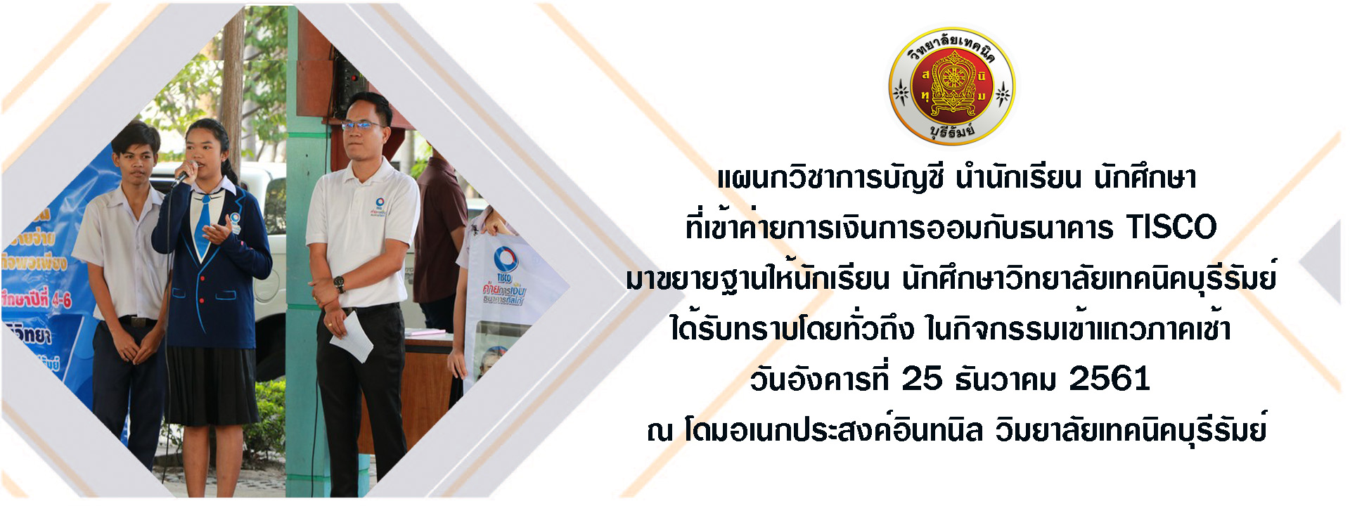 แผนกวิชาการบัญชี นำนักเรียน นักศึกษาที่เข้าค่ายการเงินการออมกับธนาคาร TISCO มาขยายฐานให้นักเรียน นักศึกษาวิทยาลัยเทคนิคบุรีรัมย์ ได้รับทราบโดยทั่วถึง ในกิจกรรมเข้าแถวภาคเช้า วันที่ 25 ธันวาคม 2561 ณ โดมอเนกประสงค์อินทนิล...