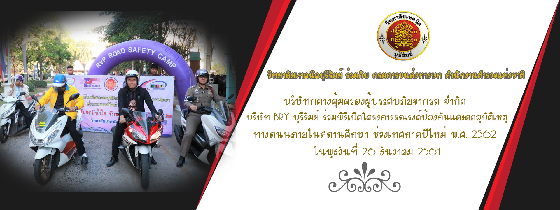 วิทยาลัยเทคนิคบุรีรัมย์ ร่วมกับ กรมการขนส่งทางบก สำนักงานตำรวจแห่งชาติ บริษัทกลางคุ้มครองผู้ประสบภัยจากรถ จำกัด บริษัท BRY บุรีรัมย์ ร่วมพิธีเปิดโครงการรณรงค์ป้องกันและลดอุบัติเหตุทางถนนภายในสถานศึกษา ช่วงเทศกาลปีใหม่ พ.ศ. 2562 ในวันที่ 26 ธันวาคม 25...