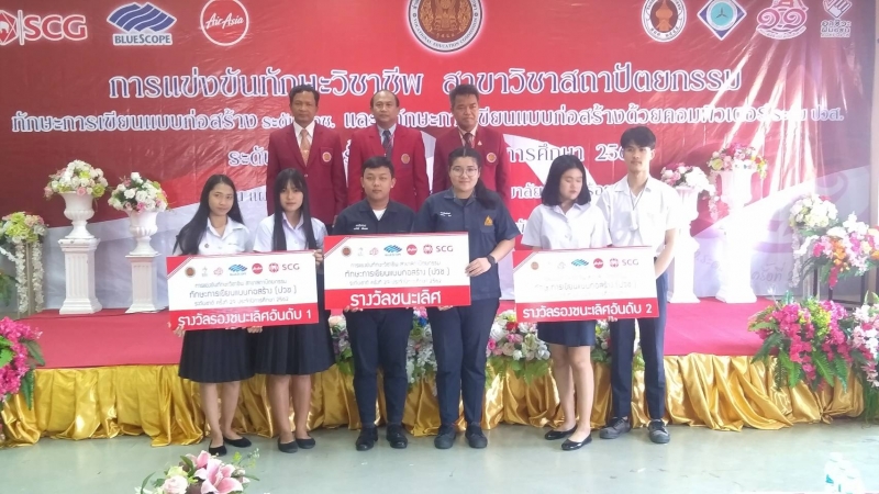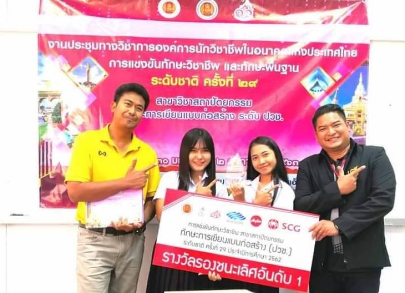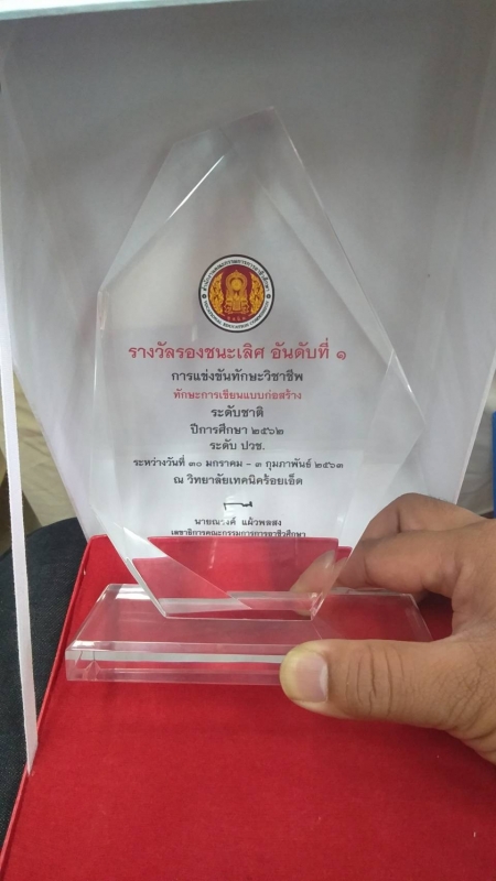 - รางวัลรองชนะเลิศอันดับ 1 การแข่งขันทักษะวิชาชีพ ทักษะการเขียนแบบก่อสร้าง ระดับ ปวช.