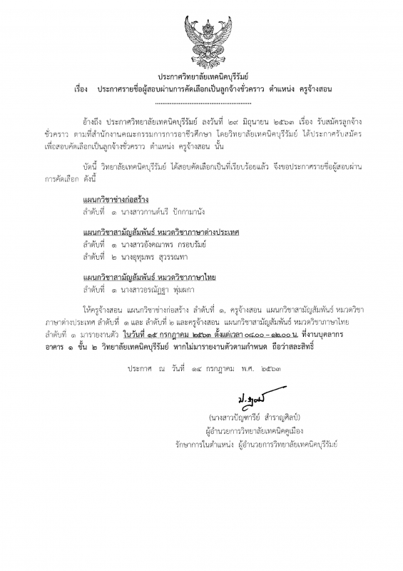 ประกาศรายชื่อผู้สอบผ่านการคัดเลือกเป็นลูกจ้างชั่วคราว ตำแหน่ง ครูจ้างสอน แผนกวิชาช่างก่อสร้าง แผนกวิชาสามัญสัมพันธ์ หมวดวิชาภาษาต่างประเทศ แผนกวิชาสามัญสัมพันธ์ หมวดวิชาภาษาไทย