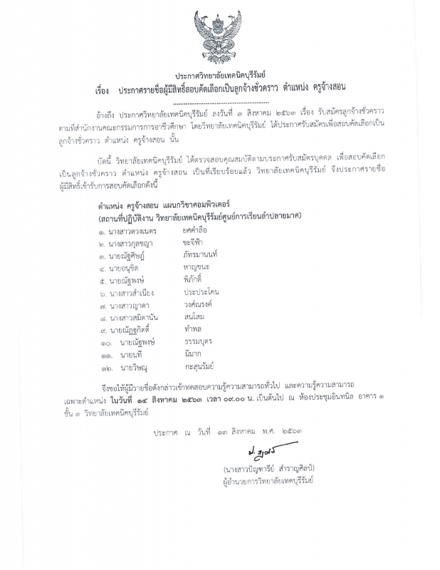 ประกาศวิทยาลัยเทคนิคบุรีรัมย์ รายชื่อผู้มีสิทธิ์สอบคัดเลือกเป็นลูกจ้างชั่วคราว ตำแหน่งครูจ้างสอน แผนกวิชาคอมพิวเตอร์ วิทยาลัยเทคนิคบุรีรัมย์ ศูนย์การเรียนรู้ลำปลายมาศ