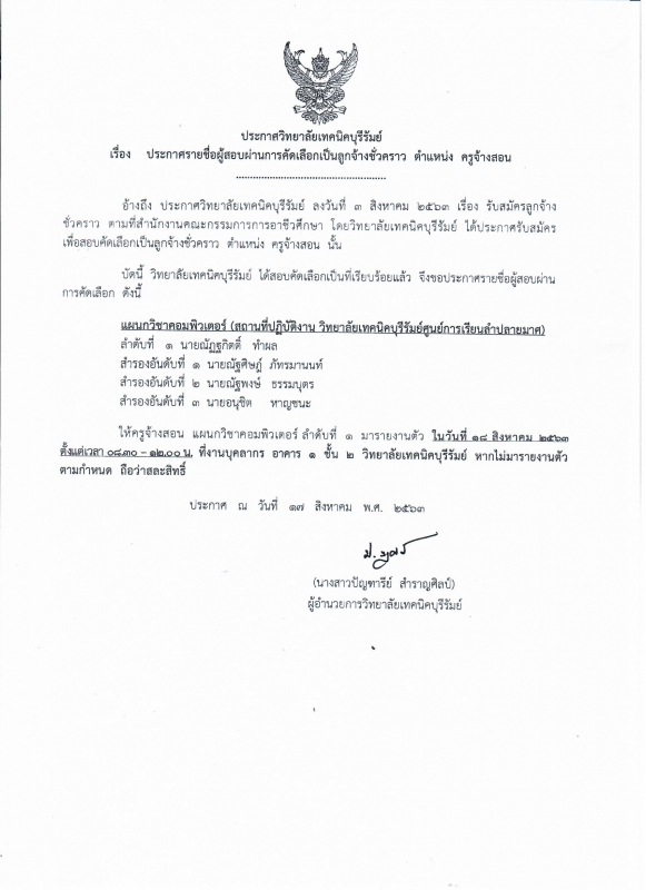 ประกาศวิทยาลัยเทคนิคบุรีรัมย์ รายชื่อผ่านคัดเลือกเป็นลูกจ้างชั่วคราว ตำแหน่งครูจ้างสอน แผนกวิชาคอมพิวเตอร์ วิทยาลัยเทคนิคบุรีรัมย์ ศูนย์การเรียนรู้ลำปลายมาศ