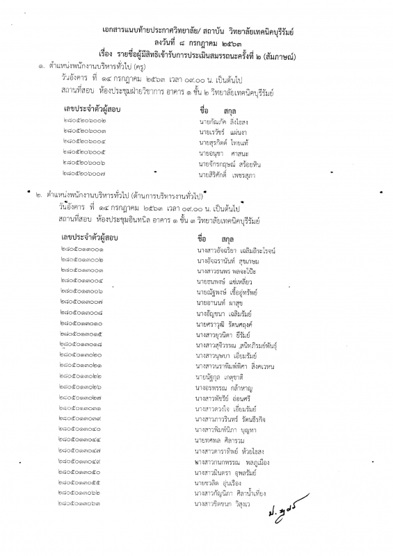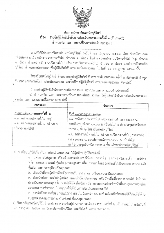 เรื่อง รายชื่อผู้มีสิทธิเข้ารับการประเมินสมรรถนะครั้งที่ ๒ (สัมภาษณ์) ตำแหน่งพนักงานบริหารทั่วไป (ครู) และ ตำแหน่งพนักงานบริหารทั่วไป (ด้านการบริหารงานทั่วไป) กำหนดวัน เวลา สถานที่ในการประเมินสมรรถนะ
